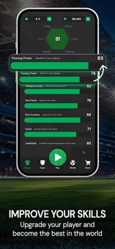 Développez vos compétences, améliorez vos capacités et prenez des décisions qui feront de vous le leader de votre équipe. Un système de progression bien conçu vous permet d'améliorer les caractéristiques de votre joueur et d'atteindre les sommets du football mondial.