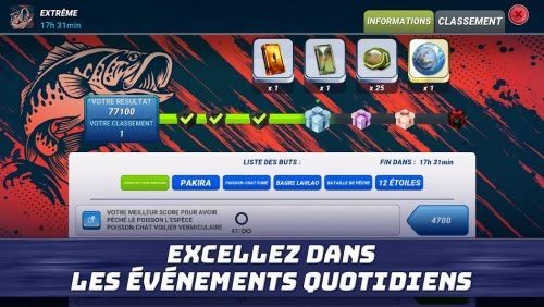 Pour les amateurs de défis, le jeu propose des duels, des tournois et des matchs en équipe où vous pouvez tester votre agilité et votre capacité à répondre rapidement aux défis. Les quêtes vous donnent la possibilité de gagner des récompenses rares pour améliorer votre équipement ou développer vos compétences. Participez à des batailles de clans pour explorer encore plus d'opportunités de pêche en compagnie d'alliés partageant les mêmes passions.