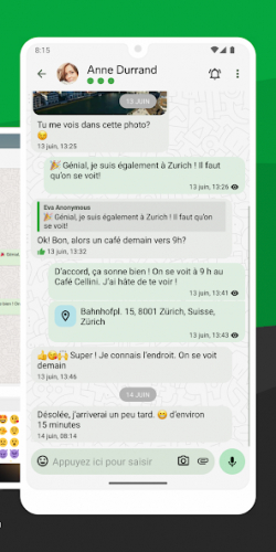 Threema est une application qui place votre vie privée au premier plan. Plus besoin de vous inquiéter que quelqu'un intercepte vos messages ou accède à vos conversations. Toutes vos données sont protégées par un puissant chiffrement et stockées sur des serveurs en Suisse, où les lois protègent strictement les informations personnelles.