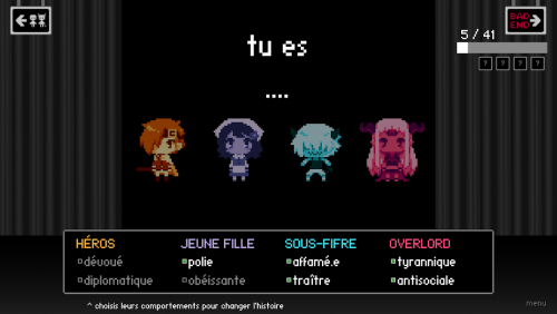 Dans l'univers de Bad End Theater, vos décisions influencent directement les actions des autres personnages. Vous pouvez manipuler leur comportement et ouvrir de nouvelles lignes dramatiques dans l'histoire. Cependant, chaque chemin mène inévitablement à une mauvaise fin. Vous déterminerez quels traits définissent la personnalité des héros et comment leur destin s'en trouve changé. Choisissez parmi: